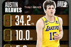 34.2+10+5.6!贝弗利转发前队友里夫斯场均数据图: