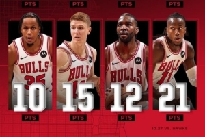 集体发挥&助队开季3连胜!公牛官推晒八人得分上双数据海报