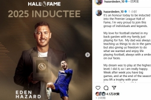 进英超名人堂!阿扎尔:奖杯也属于队友和教练,你们是我的全世界